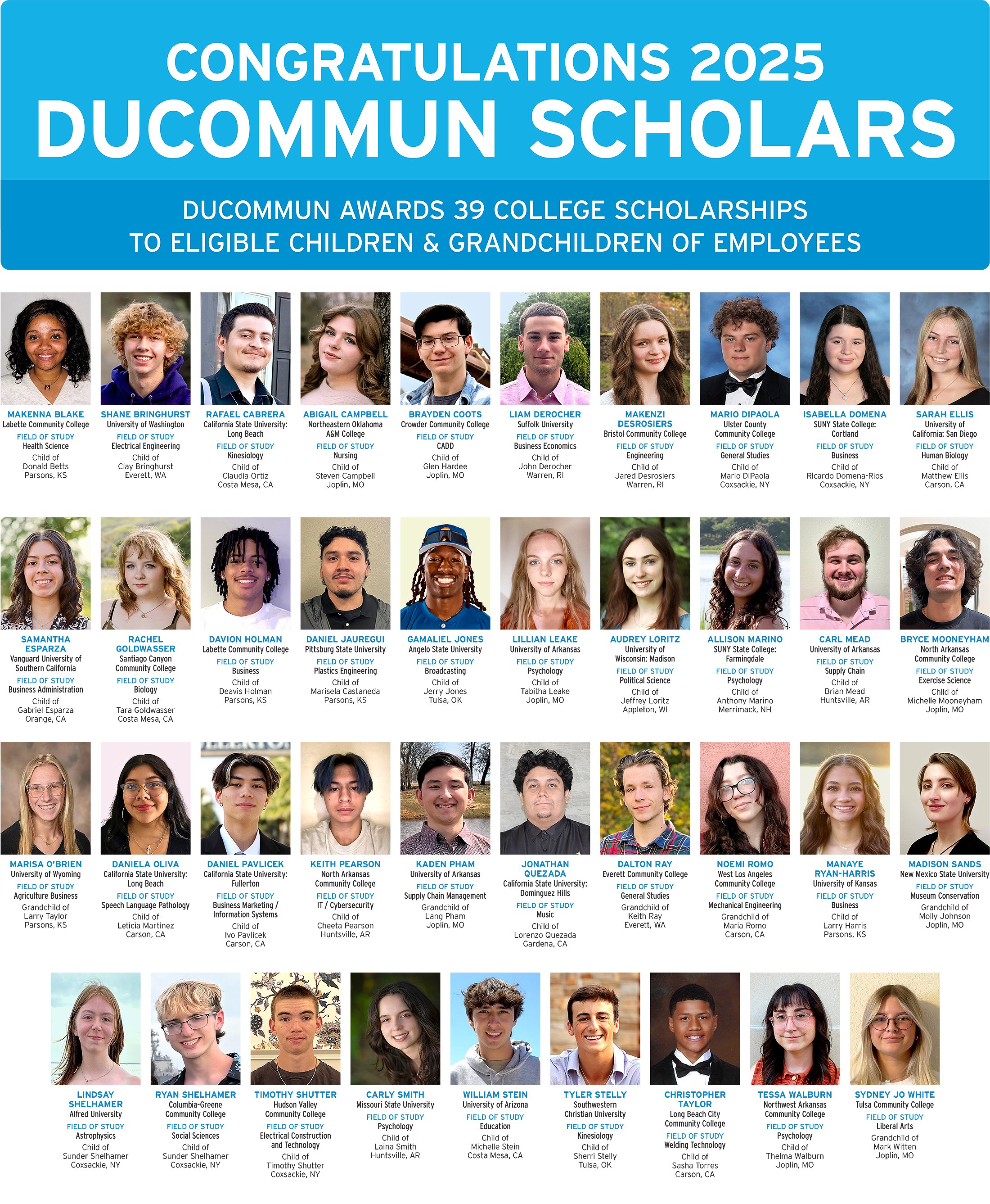 Ducommun Incorporated (NYSE: DCO) recognizes the 39 Ducommun Scholars who will each receive a $2,000 or $3,000 scholarship for college expenses during the 2025-2026 academic year. Ducommun Scholarships are a merit-based, renewable program available exclusively to full-time employees' children and grandchildren attending a four-year college or university, or a two-year accredited technical or vocational college.